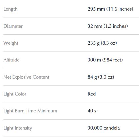 Long range,day and night distress signalling rocket. Designed to withstand exceptional environmental exposure and to perform reliably even after immersion in water. Features improved grip for easy handling and conforms to SOLAS 74/88 as amended. Rocket propels a red flare attached to a parachute to 300m and burns for 40 seconds. SOLAS requires that 12 rockets are carried on Ships Bridge and 4 rockets are fitted in liferafts and lifeboats. Also used by leisure craft.