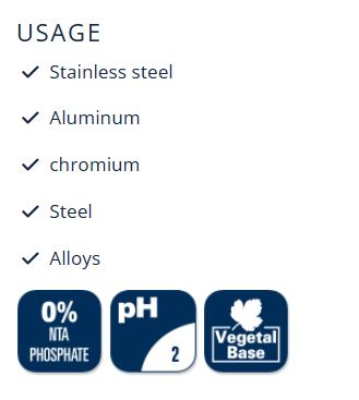 Acid base gel developed to remove rust, deoxidize, degrease and passivate stainless steel, steel, aluminium. Easily removes rust and its passivating action protects against corrosion. The treated materials look as new.