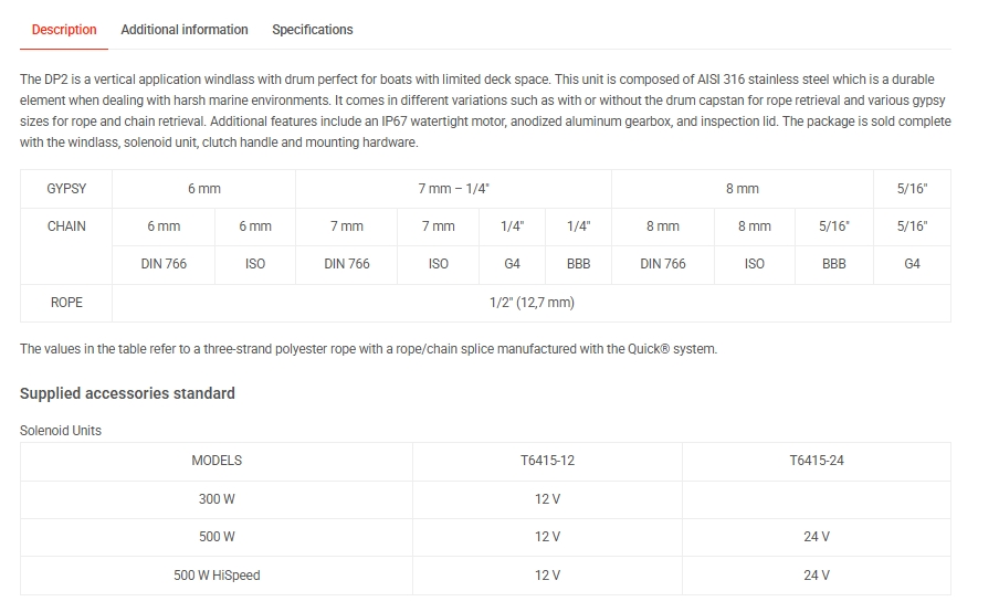 The DP2 is a vertical application windlass with drum perfect for boats with limited deck space. This unit is composed of AISI 316 stainless steel which is a durable element when dealing with harsh marine environments. It comes in different variations such as with or without the drum capstan for rope retrieval and various gypsy sizes for rope and chain retrieval. Additional features include an IP67 watertight motor, anodized aluminum gearbox, and inspection lid. The package is sold complete with the windlass, solenoid unit, clutch handle and mounting hardware.